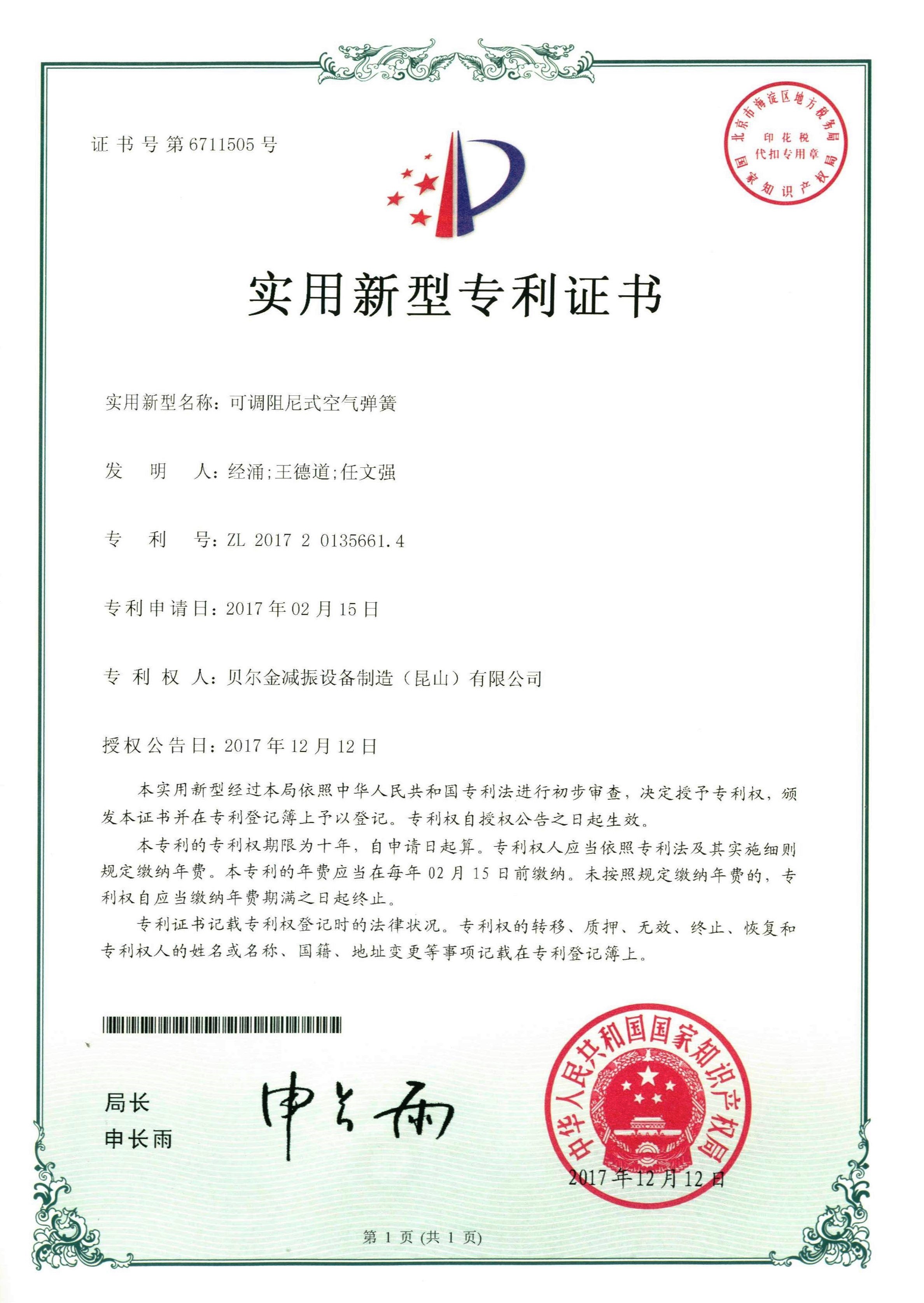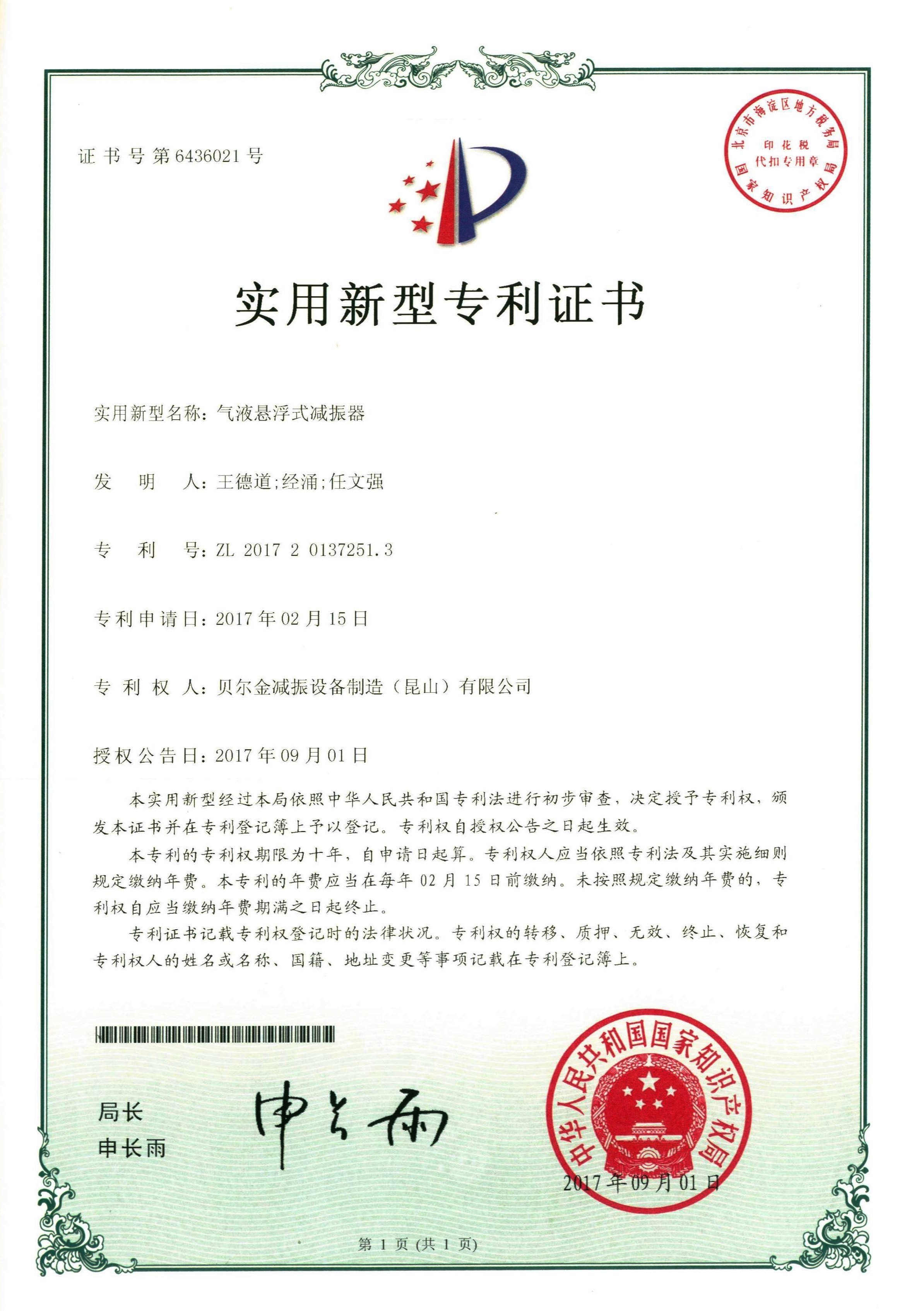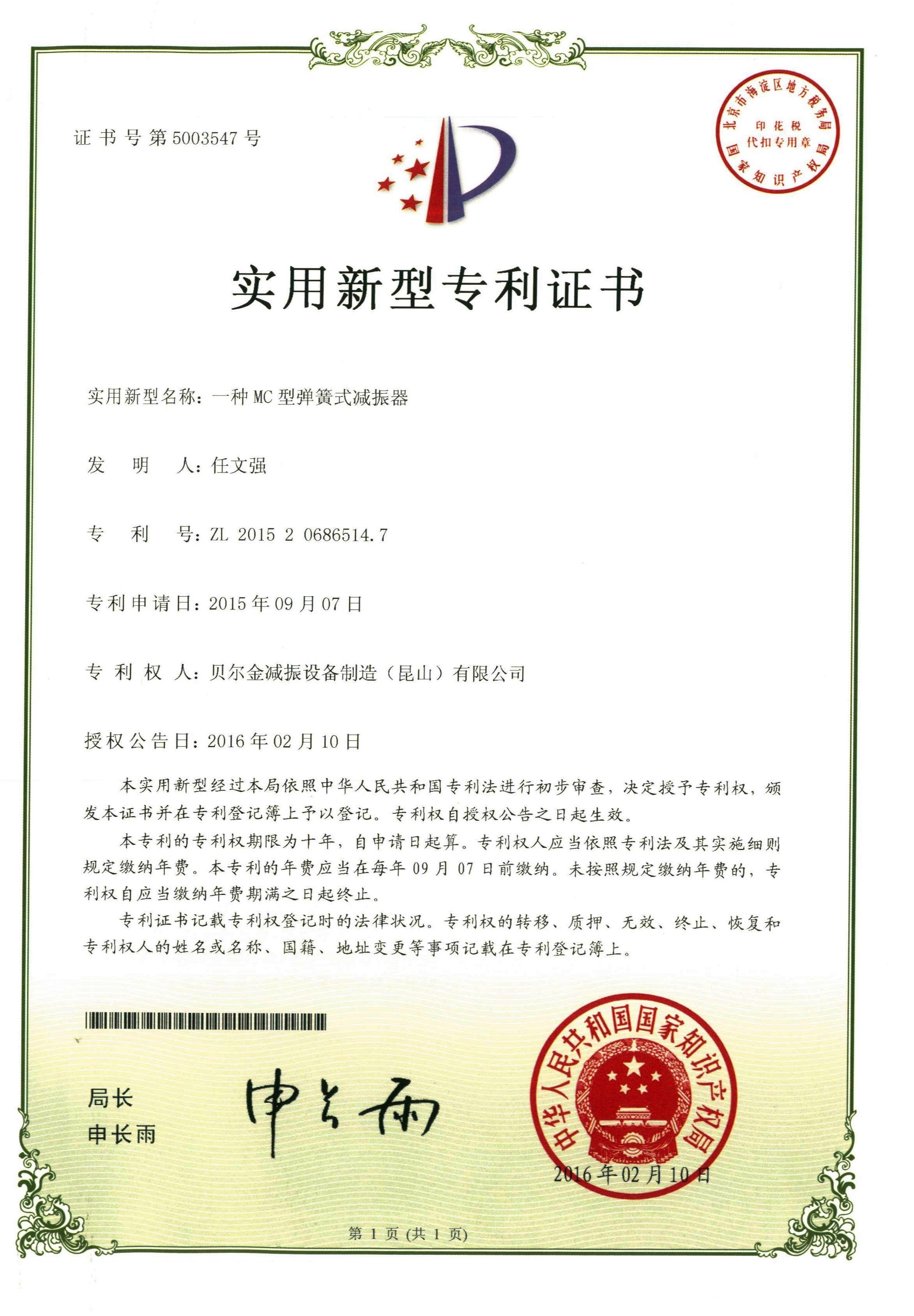 沖床減振器專利證書